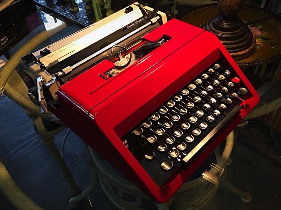 I bought an Olivetti Studio 45 some months ago. The seller’s photo made it appear white. It turned out to be a dull gray, but I bought it anyway–for twenty or so dollars, if memory serves. It was my first paint job, and it turned out rather well. I went for Ferrari red. It’s Italian, after all. No one can resist a Ferrari. In any case, I never loved the mechanics, albeit it typed fine. Later I bought an Olivetti Valentine for my girlfriend, but it was missing a shift key. The Valentine sold for $60, but these often go for more than $400. It is famously red. The 45 was happy to donate its key.