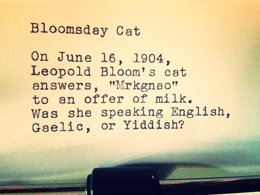 The cat starring in the photo is named Molly, after Molly Bloom. She, along with her brother, Murphy (of Beckett’s Murphy), was born on St. Patrick’s Day. History is full of mysteries.