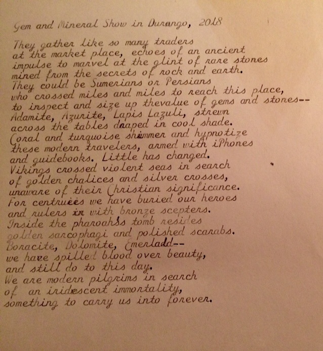 Gem and Mineral Show in Durango – a poem Posted by McFeats on July 31, 2018 Share this: Share on X (Opens in new window) X Share on Facebook (Opens in new window) Facebook Like Loading...