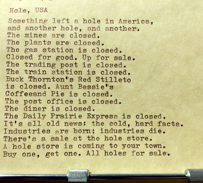 Hole, USA – a poem Posted by McFeats on August 6, 2018 Share this: Share on X (Opens in new window) X Share on Facebook (Opens in new window) Facebook Like Loading...