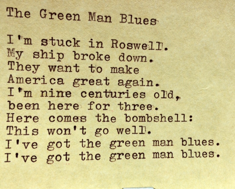 The Green Man Blues (driving through Roswell) Posted by McFeats on August 6, 2018August 6, 2018 (An aside: We also passed a store called Yolanda’s Typing Service. I wasn’t able to take a photo. File this under X.) Share this: Share on X (Opens in new window) X Share on Facebook (Opens in new window) Facebook Like Loading...