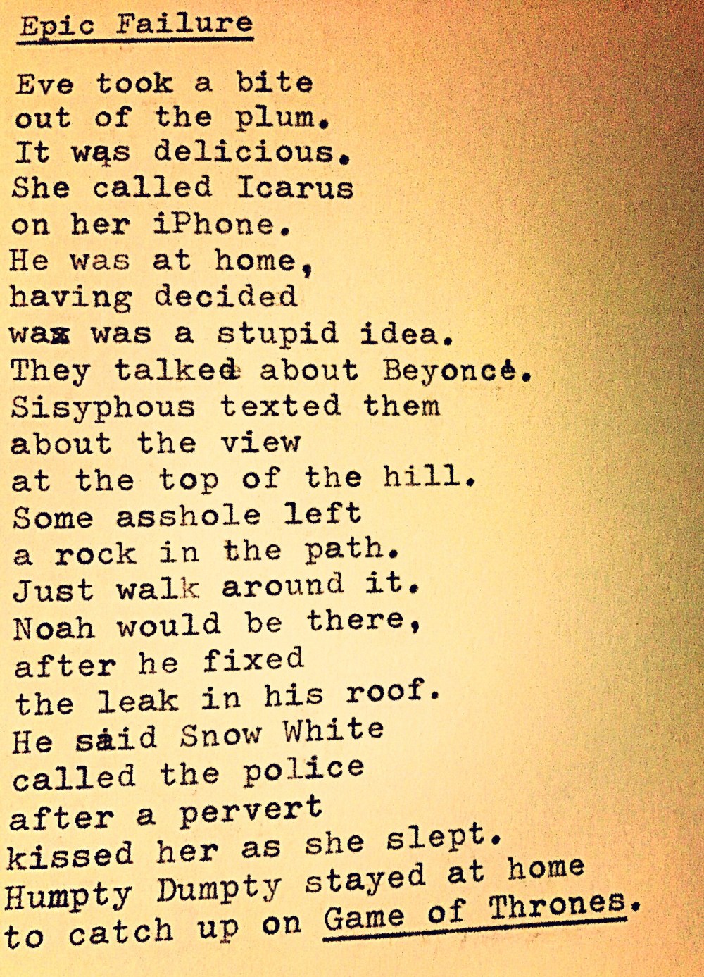 Epic Failure – a poem Posted by McFeats on August 20, 2018 Share this: Share on X (Opens in new window) X Share on Facebook (Opens in new window) Facebook Like Loading...