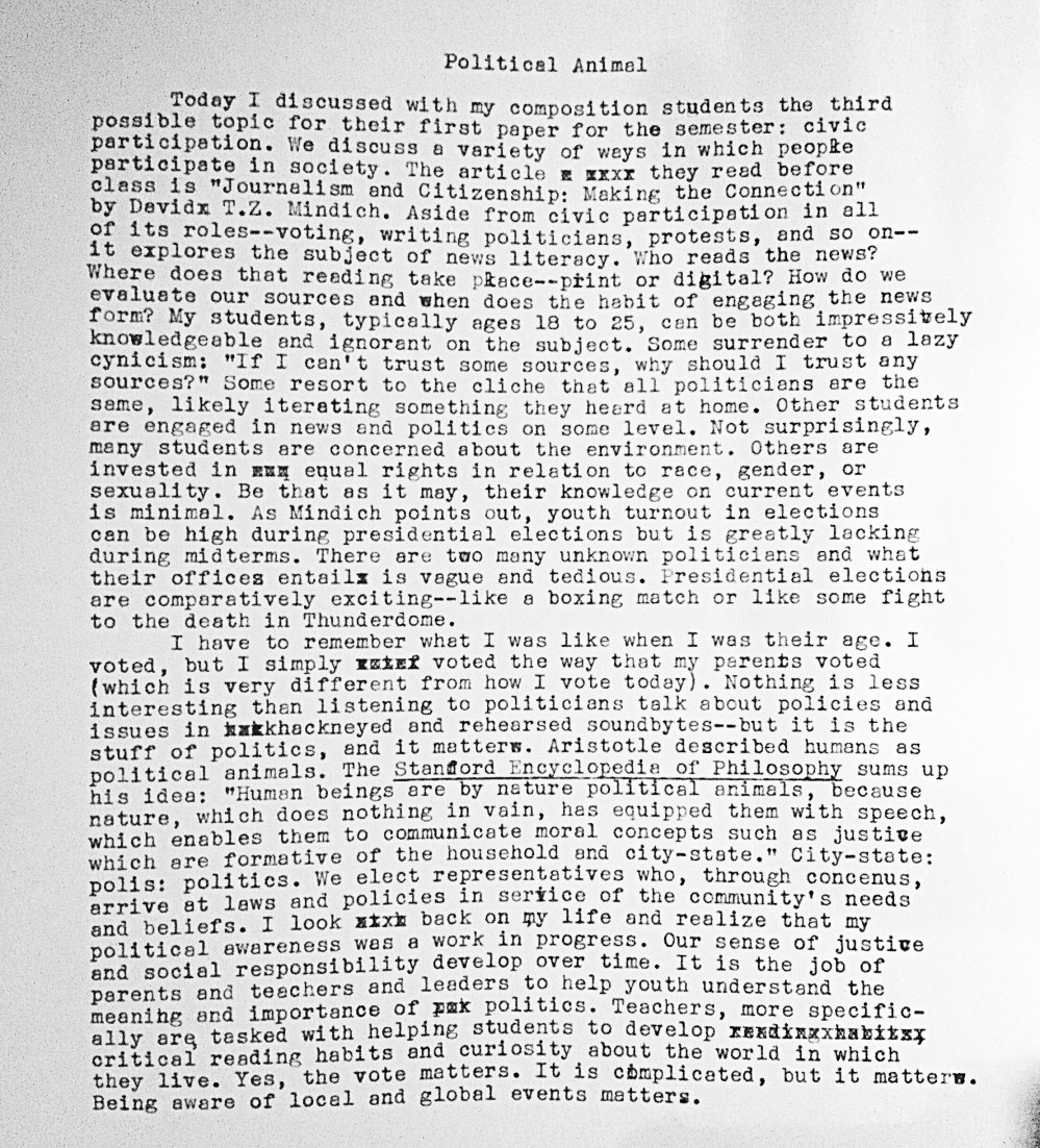 Political Animal: Thoughts on Youth and Civic Participation Posted by McFeats on August 30, 2018 Share this: Share on X (Opens in new window) X Share on Facebook (Opens in new window) Facebook Like Loading...