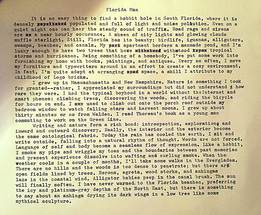 Even with the population and pollution mentioned straight off, Florida still comes off as a paradise in your essay. The irrepressability of nature is one of South Florida’s most attractive features. Even with all US culture has done to it over the past century–draining the wetlands, paving acre after acre, putting up strip malls and freeways and theme parks, releasing exotic pets from all over the world into the wild to devour the native animals–much of Florida still seems wild. I grew up in Michigan, which is considered a paradise by urban Chicagoans who know it as their summer escape. But wilderness has had a tougher time there. By the 1970s, the only untouched old-growth forest was a tiny patch not far from Detroit. In the 1970s, practically as I watched, the creeks lost their fish and crustaceans as agricultural chemicals ran off into the watersheds. The Great Lakes, of course, once fabulous inland seas rich with a fresh-water ecosystem all their own, are virtually dead—almost empty of life except for fish artificially stocked for sport fishers, the water so clear that shipwrecks a hundred feet below the surface are clearly visible from above. What’s left in Michigan are landscapes, mosquitos, and managed forests that harbor the few species allowed to survive, such as deer and turkey. Enough for some.