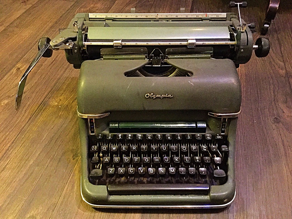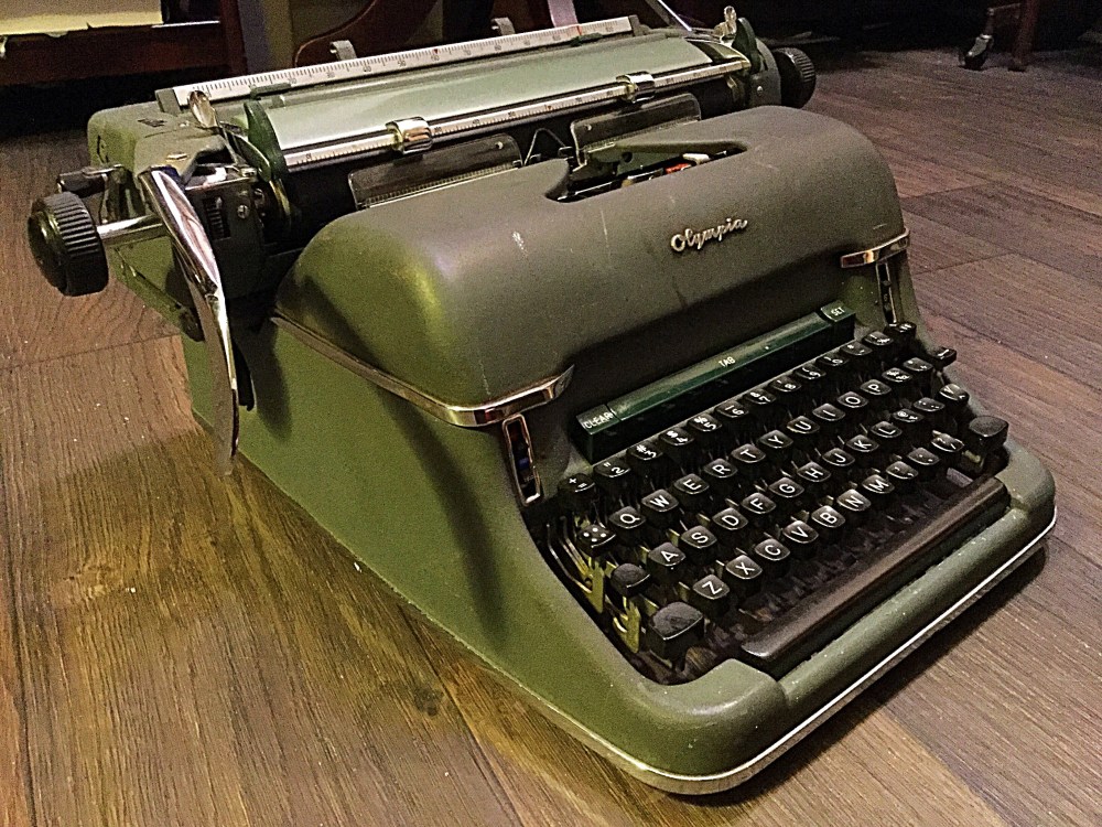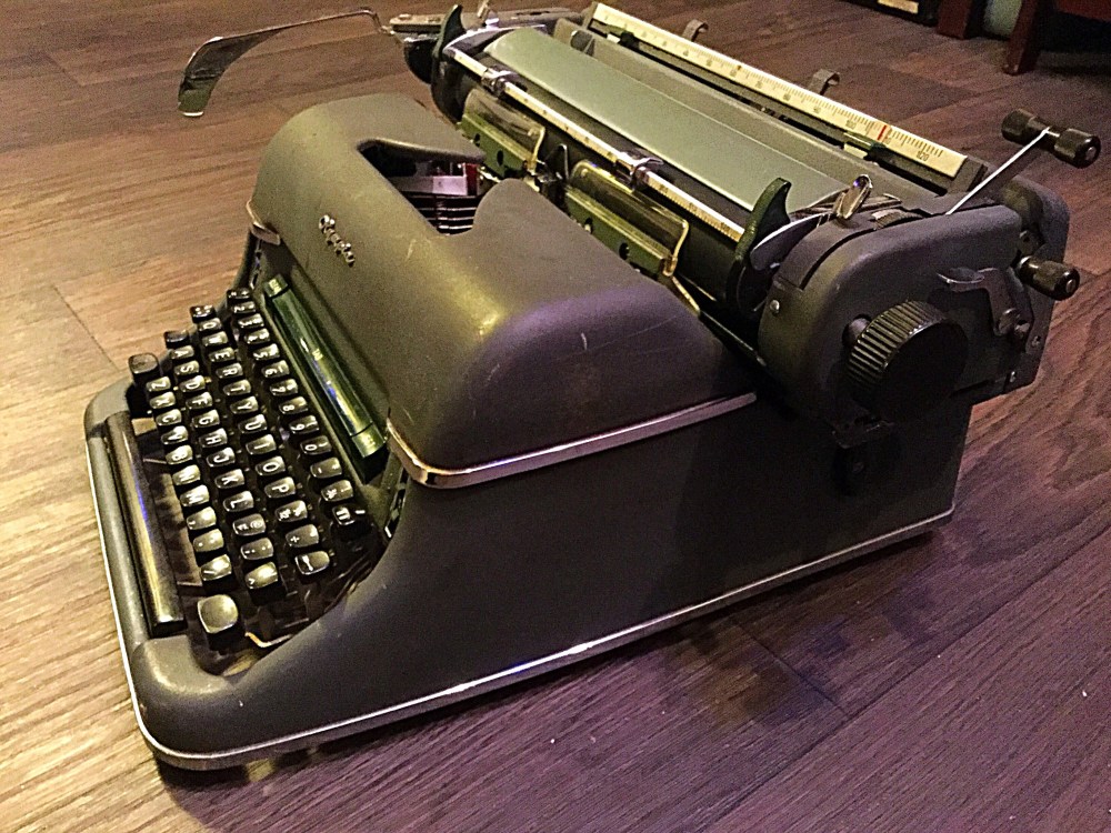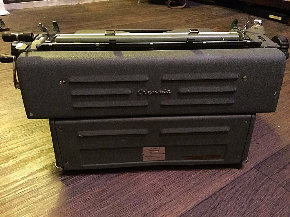A friend of mine sent me a replacement cover for this SG1. (It arrived today.) I picked up the typewriter–dirty, sticky, and coverless–for $20.00 from a local antique dealer two weeks ago. I figured no one would buy it without a cover. Now it’s clean and complete. These machines sell for good money. Should I sell it or put it in my office at work? (I could dispense with a Royal KMM at work.) It has the same typeface as my other SG1. The cover is a little scratched up, but the guts are clean. The slugs were sluggish but now type speedily. I hammered out a dent in the back with a rubber mallet. I vacuumed out the decayed padding. I haven’t cleaned the keys yet, but this machine is ready to make words.