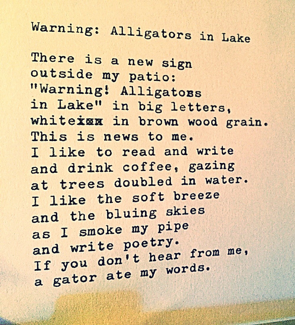 Warning: Alligators in Lake – a poem Posted by McFeats on September 21, 2018 Share this: Share on X (Opens in new window) X Share on Facebook (Opens in new window) Facebook Like Loading...
