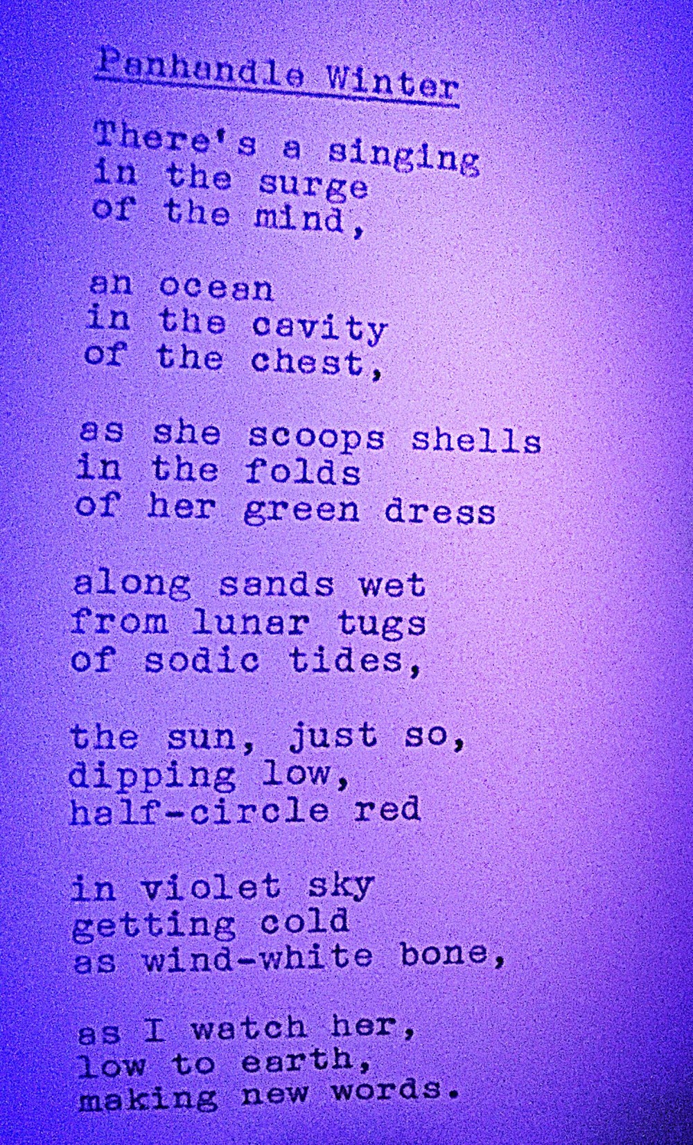 This poem recollects one of my favorite memories: a day my girlfriend and I spent at Alligator Point just south of Tallahassee. It was winter. The air was cold and the evening was fast approaching. She was collecting shells on the beach as if discovering new planets. In proper Wordsworthian fashion, this poem was waiting. I typed this on my Underwood 6, which she bought me a year ago. It is the best of my old machines.