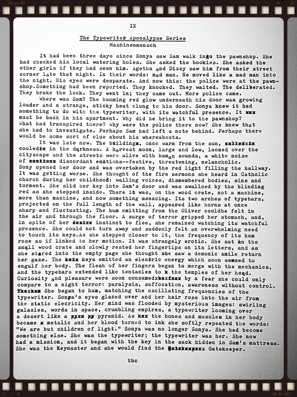 Chapter IX: Maschinenmensch (Typewriter Apocalypse Series) Posted by McFeats on September 28, 2018September 28, 2018 Share this: Share on X (Opens in new window) X Share on Facebook (Opens in new window) Facebook Like Loading...