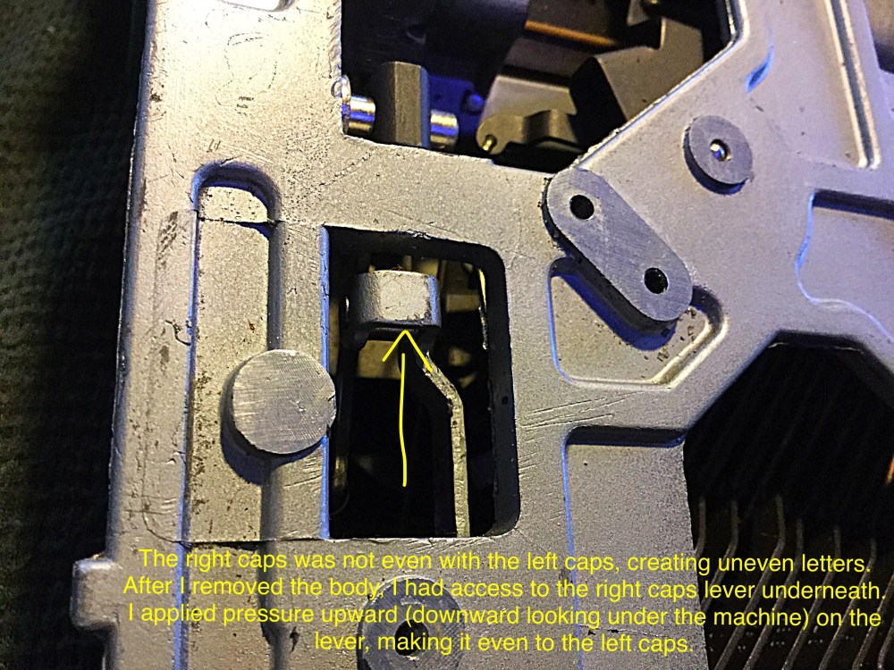 This is the second typewriter I recently acquired that had misaligned caps keys/levers. This is not related to the adjustment screws that align lower and upper case. This is a situation in which one caps key fully raises the carriage while the other caps key fails to do so.