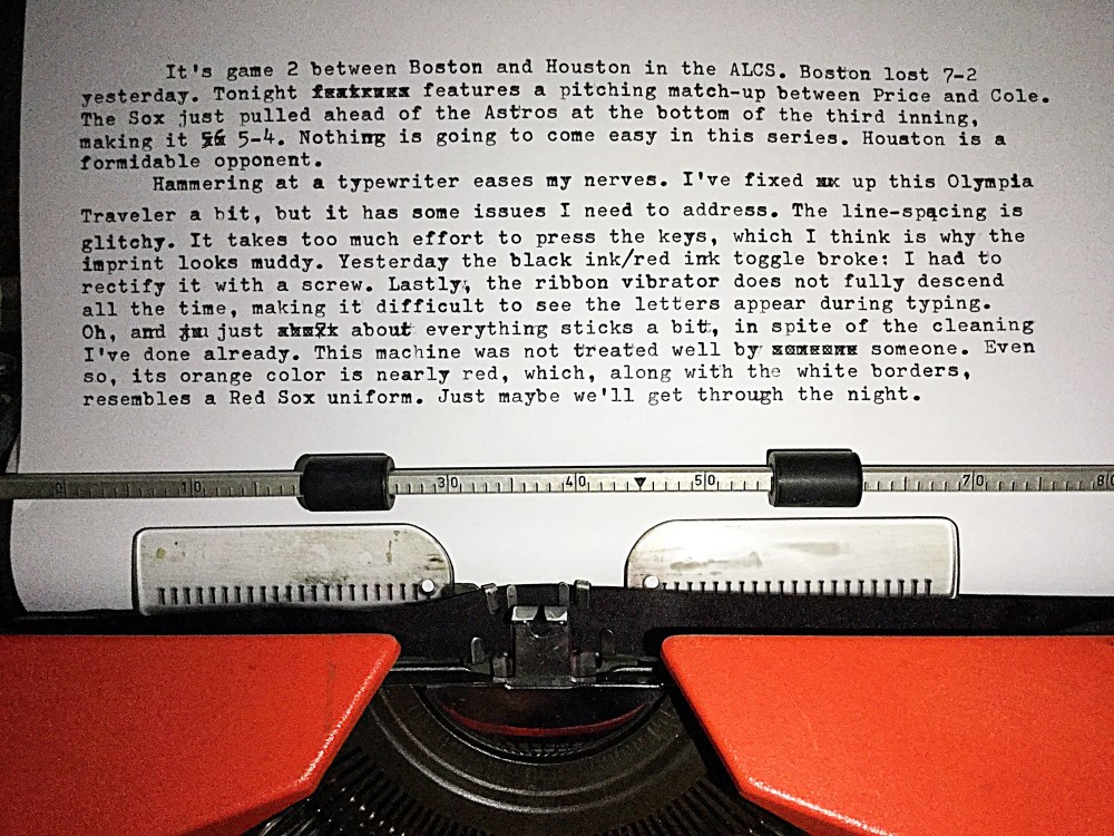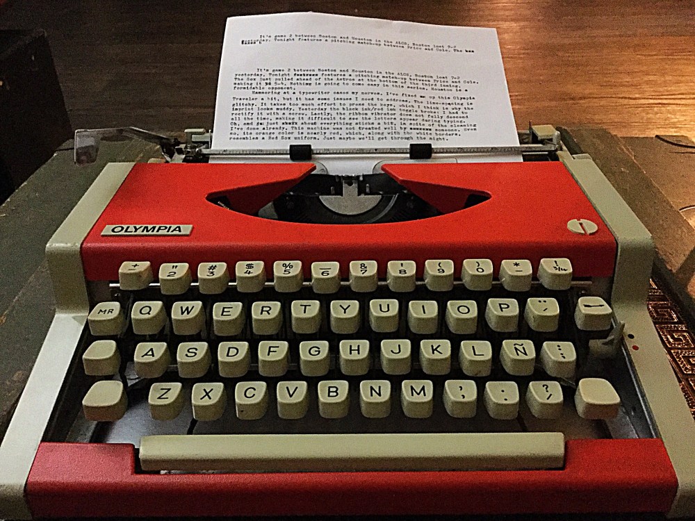 More Red Sox Typing on a Hobbled Olympia Traveler Posted by McFeats on October 15, 2018 Share this: Share on X (Opens in new window) X Share on Facebook (Opens in new window) Facebook Like Loading...