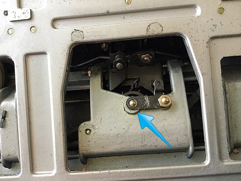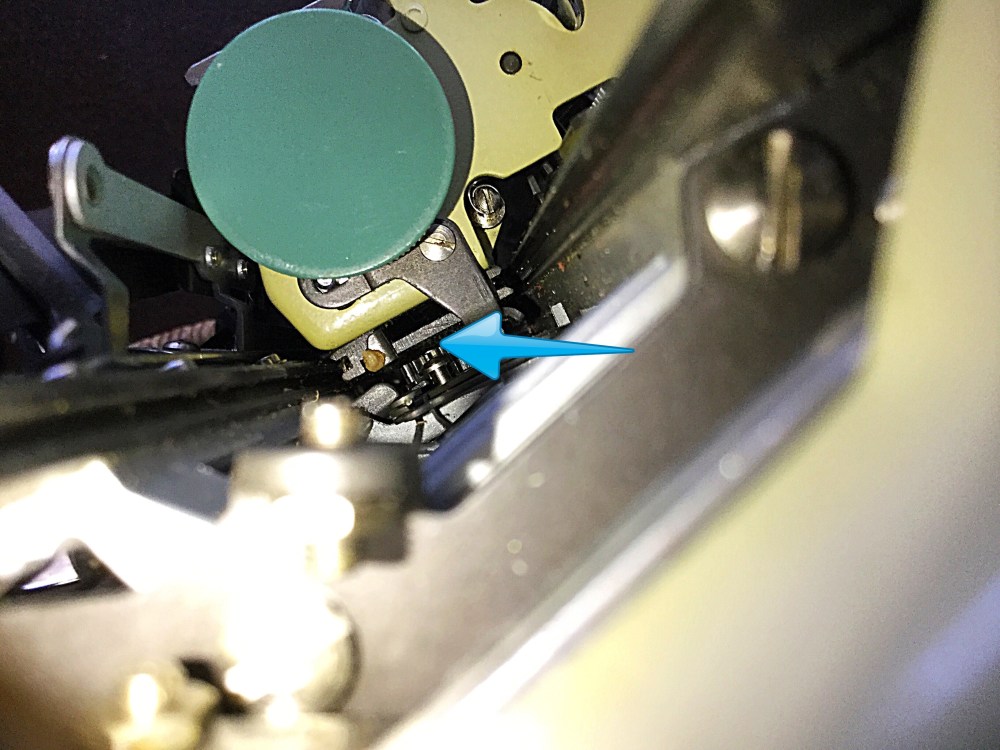 It did not seem to be the culprit. My mechanical intuition is pretty good, but I’m no savant. I have to take matters slowly to avoid making mistakes. The Socialite is no Olympia SG1. As you can see from the photos, it would be difficult to remove the bottom frame, and the space for tools and fingers is small. I took a closer look and soon realized that the escapement wheel was moving up and down and instead of staying in place. This meant that it occasionally slipped out of alignment with the loose-dog, obstructing clearance. I realized that the nut that would have held the wheel in place was missing. I had luckily found a nut on my floor the other day. Yes, it was a match. Now, how to bring the screw down so that the nut could be secured correctly? I did not want to remove the carriage. Could I push the screw down from the side in this narrow space?