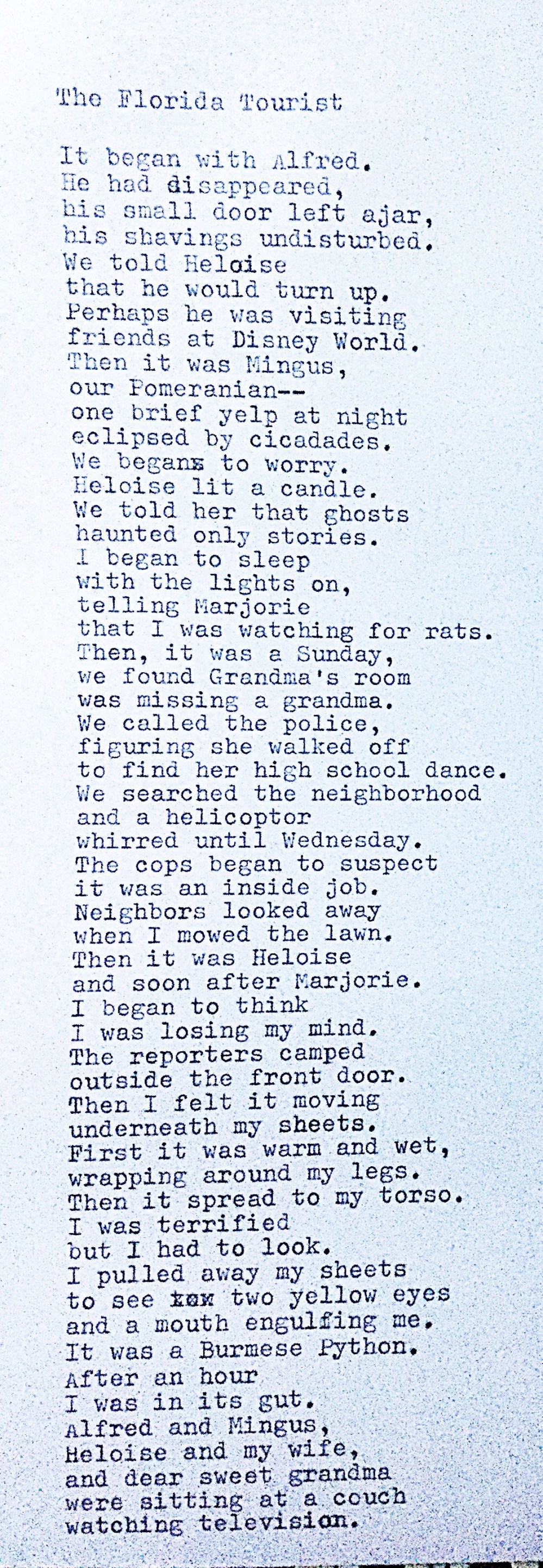 Thanks. I had to end it quickly. Ran out of page. There is more and more news in Florida about the invasive python taking over the Everglades. I live in Jurassic Park.