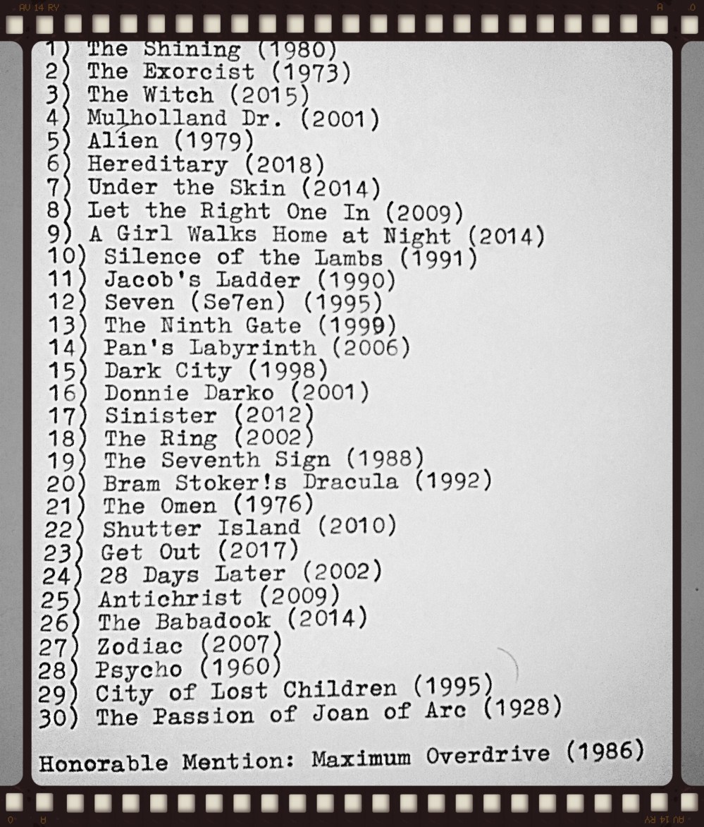 A great list! I could write a couple paragraphs on almost each of the movies I’ve seen (18, I think). I’ve never thought of myself as a horror fan—and I’m emphatically not interested in slasher films or torture porn—but I love thought-provoking psychological studies, which would be my label for my favorites on your list. You’re entitled to classify films any way you like, and you’ve explained your reasoning, but to me “Mulholland Drive,” for example, can’t really be classified as horror unless you classify all of David Lynch’s work as horror for its unsettling imagery and disregard for conventional, real-world narrative. “Eraserhead” would be the prime example of horror in his canon.
