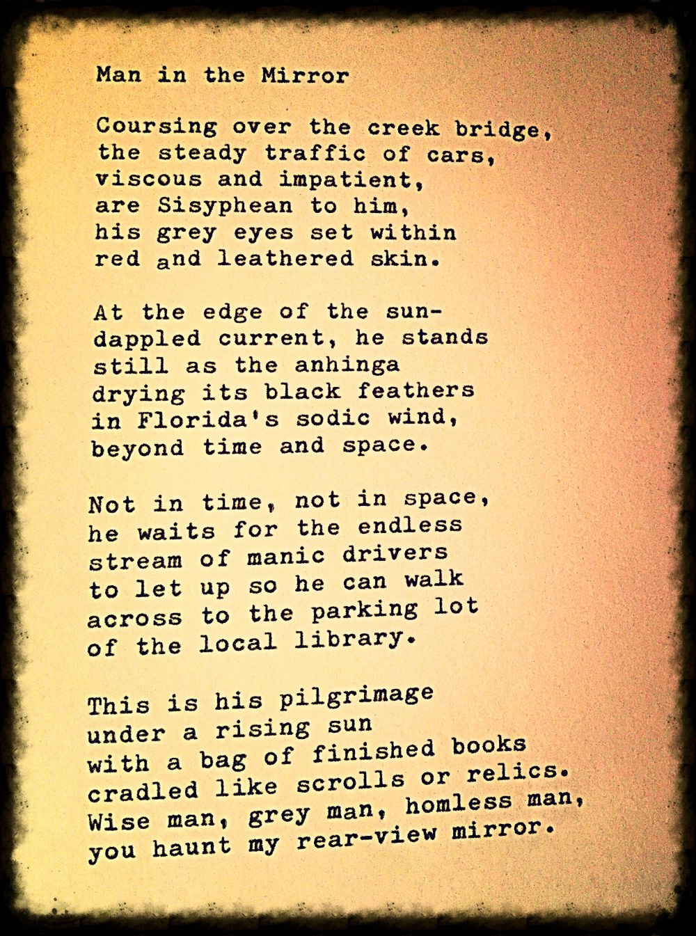 Man in the Mirror – a poem Posted by McFeats on November 8, 2018 Share this: Share on X (Opens in new window) X Share on Facebook (Opens in new window) Facebook Like Loading...