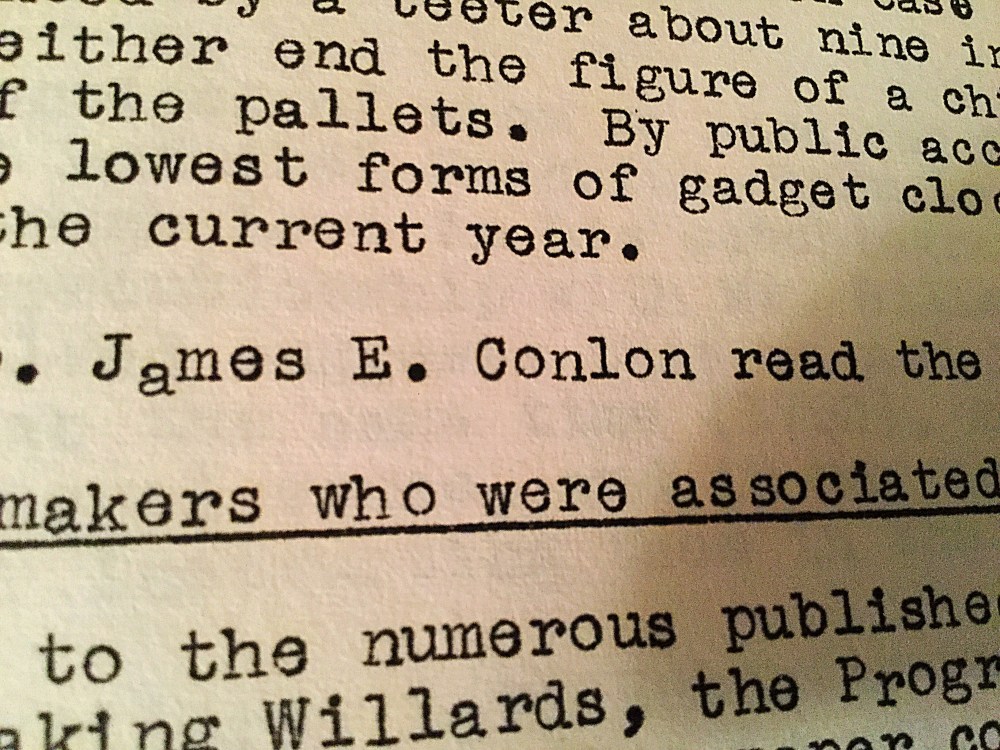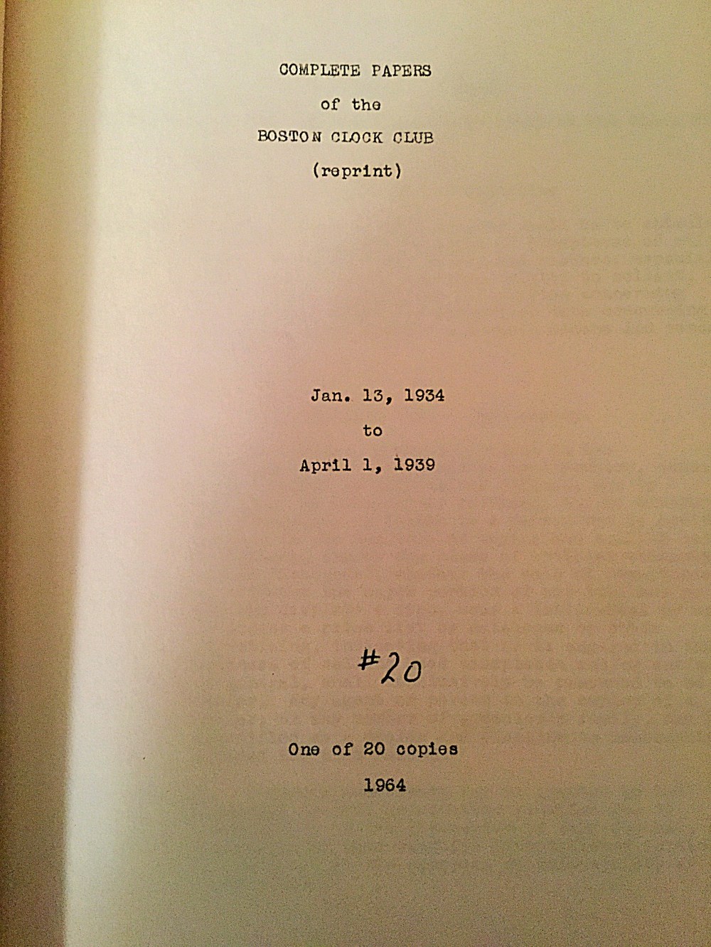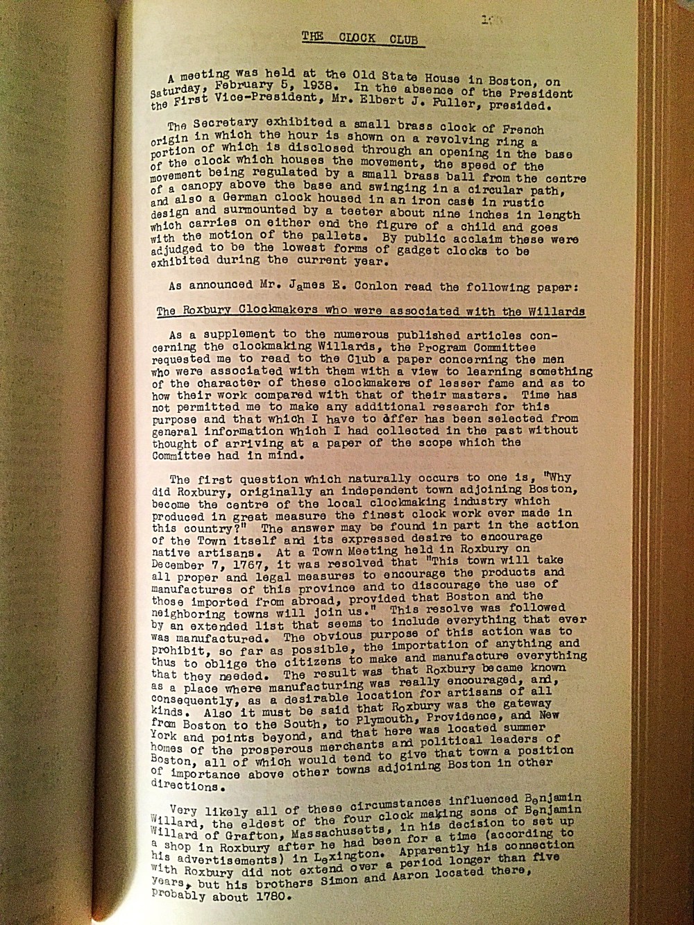 I was visiting my parents this weekend. In spite of some political differences, we broke bread and had a great time. We shared stories, many of which were family stories. I’m taking home a few items, given to me due to the proclivities I share with some ancestors. One is a book, The Complete Papers of the Boston Clock Club. My great-grandfather, James Conlon, a well-known clock maker himself, was a member, at one point serving as its president.
