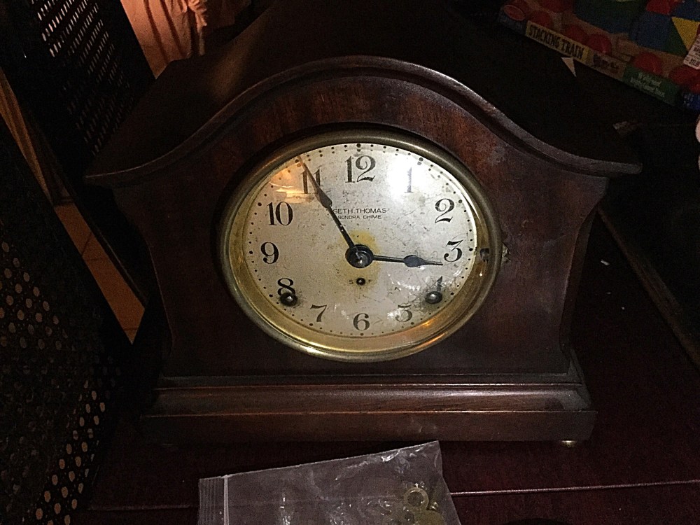 Later today I looked at the Seth Thomas clock sitting on the piano. Conversely, this clock comes from my father’s side. I remember looking at it when I visited his parents’ home in Brighton.