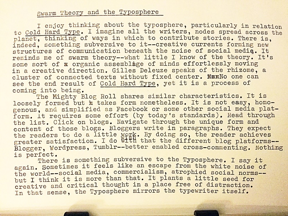 Good observations. It does feel kind of like typewriting on a manual, in comparison to a quick post on Facebook, for example. Especially my platform, Blogger, has been difficult recently in enabling comments; I’ve found it necessary to enable private browsing before I’m permitted to login to comment on another Blogger-based blog.