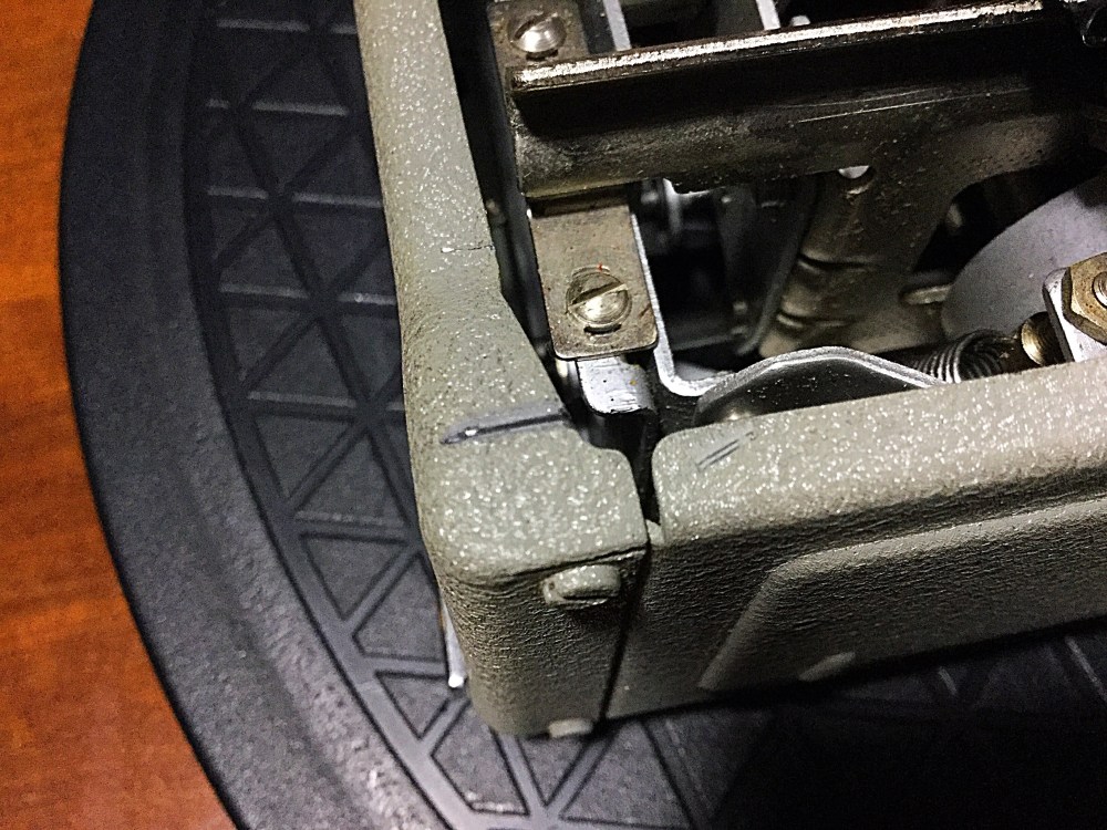 He picked up the machine, which is in excellent shape, barring a small and fleeting catch when returning the carriage. It types perfectly well, so the escapement wasn’t an issue. I took it home today to look at it. I looked carefully at the carriage. Maybe something was stuck inside? Nope. After a while I was able to determine that it was the tabulator stops catching on the back of the body.