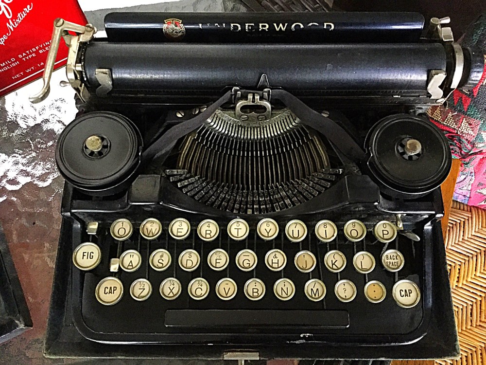 Generally speaking, I try not to pick up duplicate typewriters. A new typewriter either has to be a make or model I do not have or have a typeface I do not have. The nice thing about general rules is that they are general. I decided to blow off some steam at the nearby antique mall. There are some beat up ’60s Royals there as well as a nice Hermes Rocket that someone should buy. I have an older Hermes Rocket. During this visit, however, I spied a 3-bank Underwood portable. It appeared to be in nice shape, and the broken drawstring put it at a decent price. Given the absence of the case lid, I offered a lower price. The seller, with whom I’ve swapped stories before, agreed. This typewriter also lacks quality decals. That said, I did not want someone to turn it into a non-working display piece, so I took it home. It will be easy enough to fix the drawstring, but the machine comes with the usual flattened rollers, making paper insertion difficult. One thing at a time. This 3-bank was manufactured in 1924, whereas my other one is from 1925.