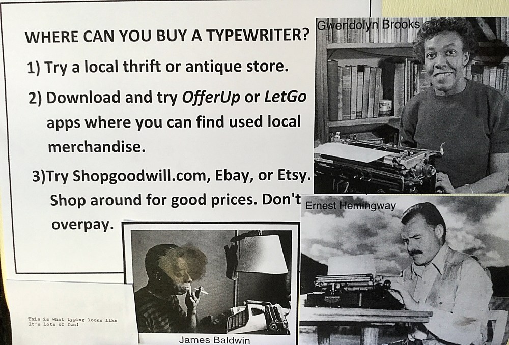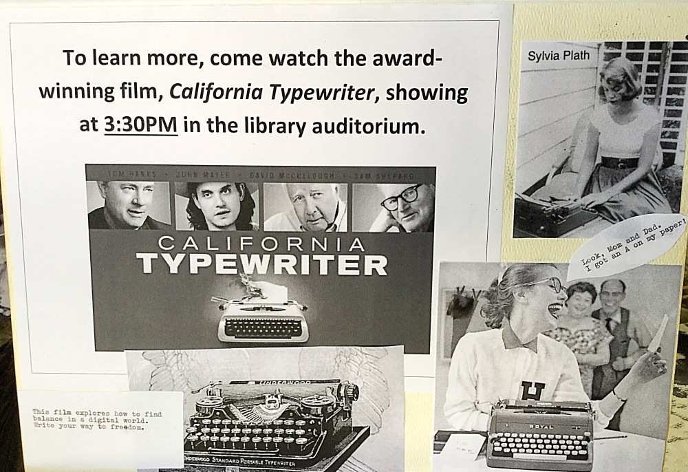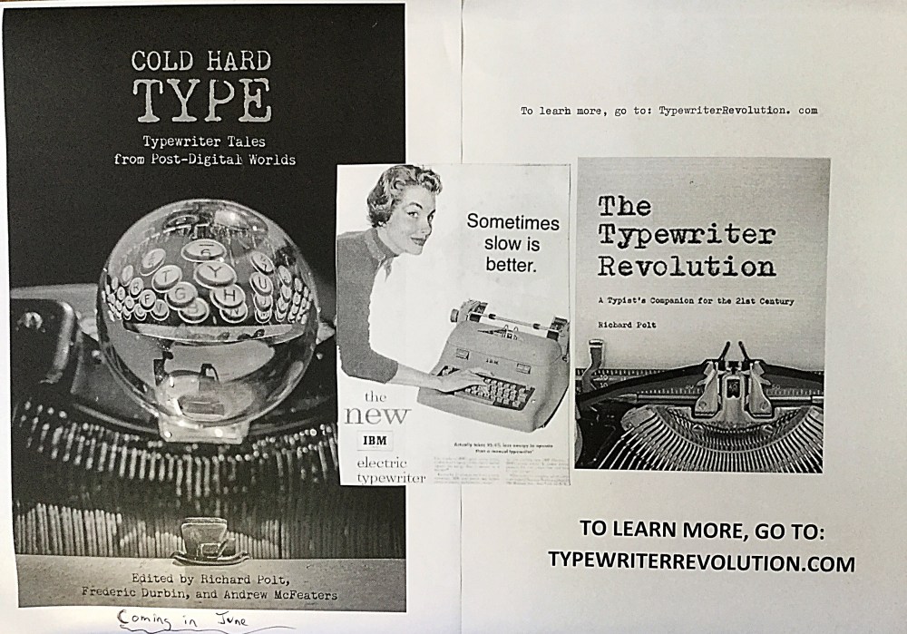 I have been facing a lot of deadlines, which means that I’ve had little time to work on my typewriter display for the table I plan to set for this year’s wRites of Spring. The goal is to allow passersby fiddle with my typewriters and to promote them in general. I also will be promoting Cold Hard Type. I also will be screening California Typewriter later in the afternoon. My display is not fancy, but it gets the job done.
