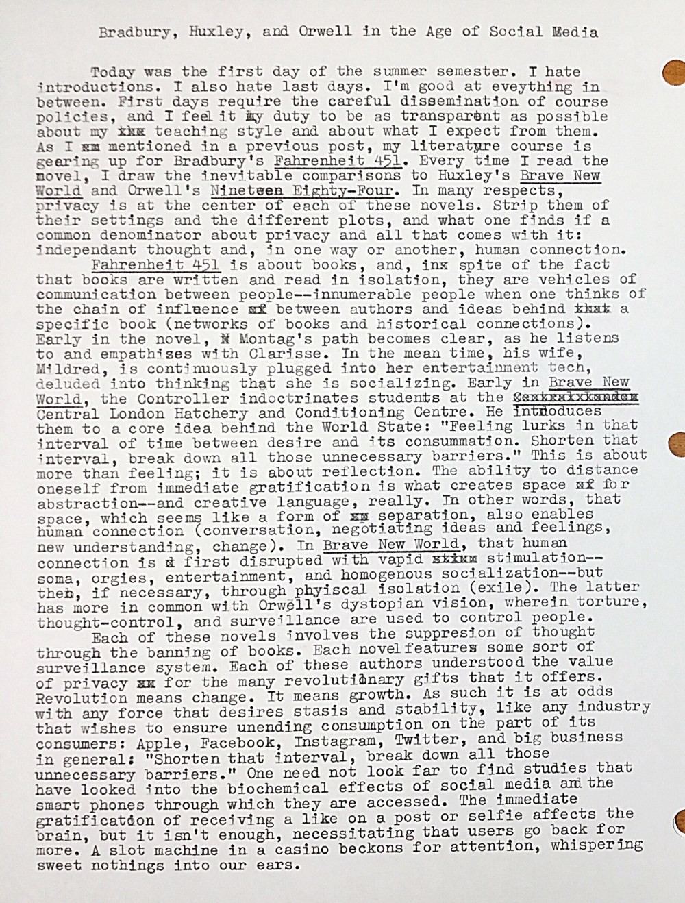 Which is why Huxley is the one who really hit the nail on the head. People are not cajoled into pursuing thoughtless activities in BNW (or at least not the Alphas, who are not genetically modified in any serious way). They participate voluntarily. There has to be some impetus to push someone beyond the world of immediate gratification. The desire to do something with one’s life has to outweigh the desire to do nothing with one’s hour.