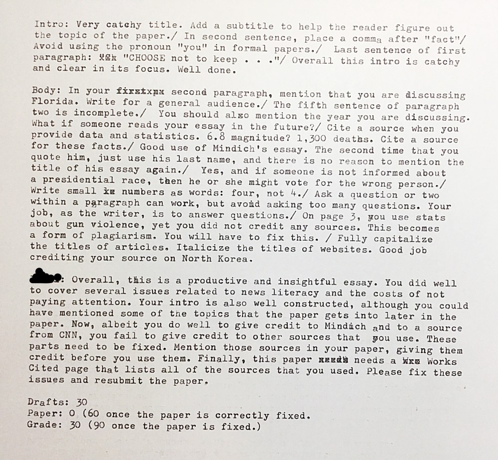 I’m in the process of grading the first stack of papers from a composition class. Recently the news cycle has covered the issue of cheating in college. Such stories generally focus on a specific form of plagiarism: fully copied papers that exemplify the worst of intentions. In reality, there are many kinds of plagiarism, and I like to draw a distinction between misdemeanor and felony plagiarism. The latter should be obvious enough. However, there are many instances when students are trying to follow the rules but lack knowledge to do so. For this reason, I treat the first paper assignment differently than I do others. Some students are not sure what does not qualify as common knowledge (which is tricky because it can vary based on one’s expertise in a field). Some students correctly credit sources in a paper but fail to understand that reference sources also need to be credited. Some students are not sure how to paraphrase material.