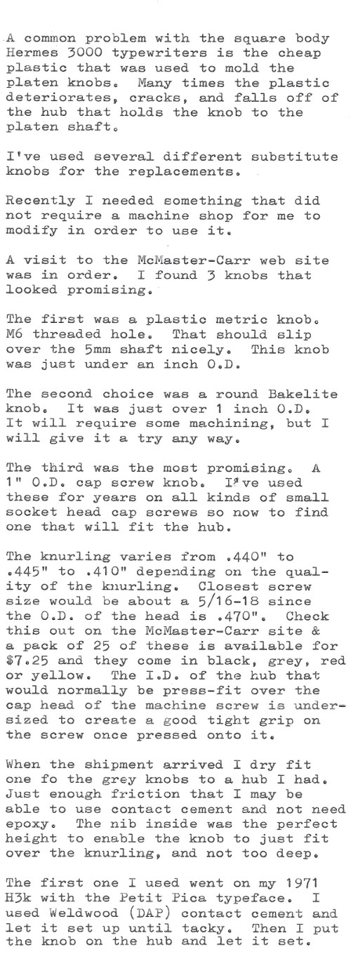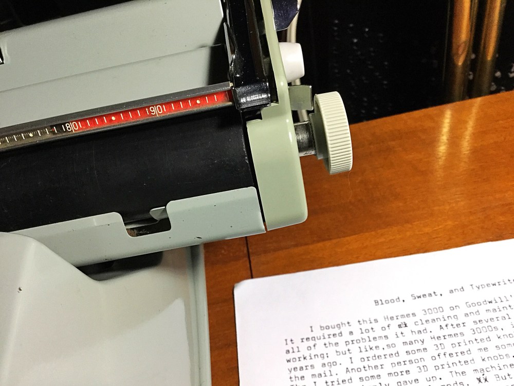 Just watched the video. My knobs look exactly like the ones on that machine — right down to the damaged left one! I’m always amazed at how the Hermes 3000 had such awful platen knobs. It would be the equivalent of a Bentley only being available with a vinyl interior. (Although I guess that’s the deal with Tesla!)