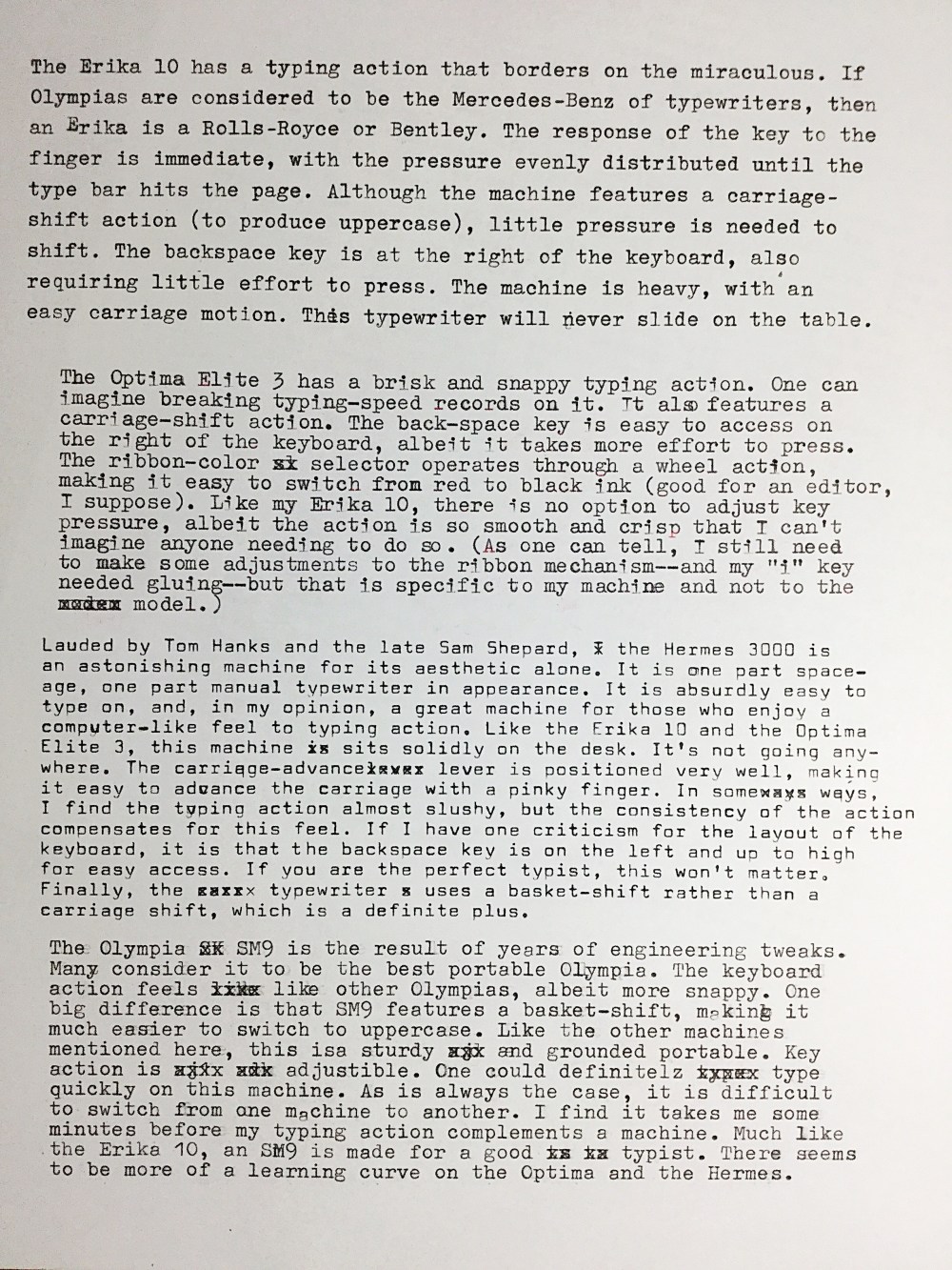 I was using my Erika 10 yesterday. It always takes me a while before I adjust to a machine. The Erika requires a light, snappy touch. It’s entirely different.
