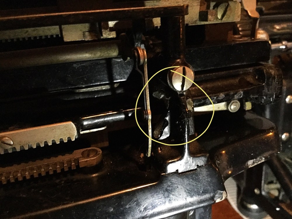 I tinkered with it for a while. At some point I noticed the cracked frame holding the carriage. The screws held it in place, but this machine had been in an accident. I also noticed the bad left platen knob–but that I saw when I bought it. I also noted the improvised right-front foot. I soon became discouraged. How foolish of me to have made the purchase. This pretty machine seemed destined for useless decoration. That’s where it ended up until yesterday, when I decided to do some tinkering.