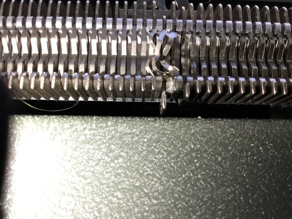 It appears that someone jammed a hockey stick into its grill. It looks like I can bend some of into place, but this stuff is like hard tinfoil. If I could get it back into place, it would likely dislodge at some point. My thought is that I should remove the bent section, along with three teeth, and get this player back onto the ice. The tab settings would not work at the center of the carriage, but the carriage would move smoothly again. As they say in hockey, it’s time to put on the foil–except, in this case, I think the foil has got to go.