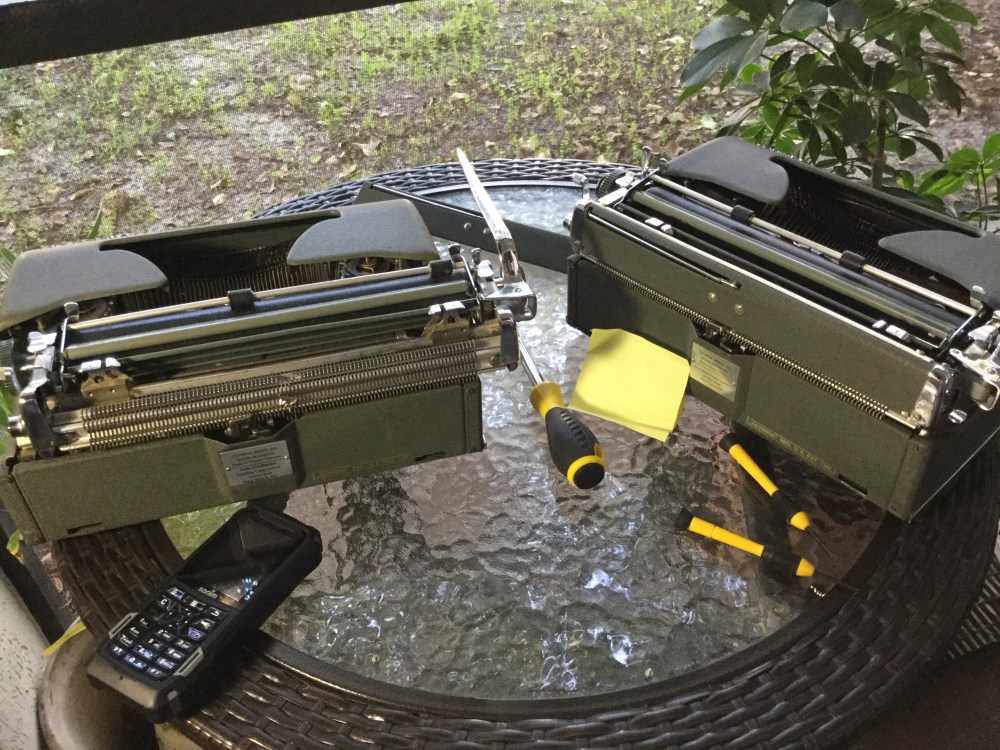 A friend of mine scored an Olympia stash the other day. He picked up four machines with different type faces. I am particularly envious of his gray SM3, which has a long carriage and is in excellent condition. This SM4, on the other hand, is jamming in the middle of the carriage. I luckily have a sibling machine for comparison, albeit the diagnosis was simple enough.