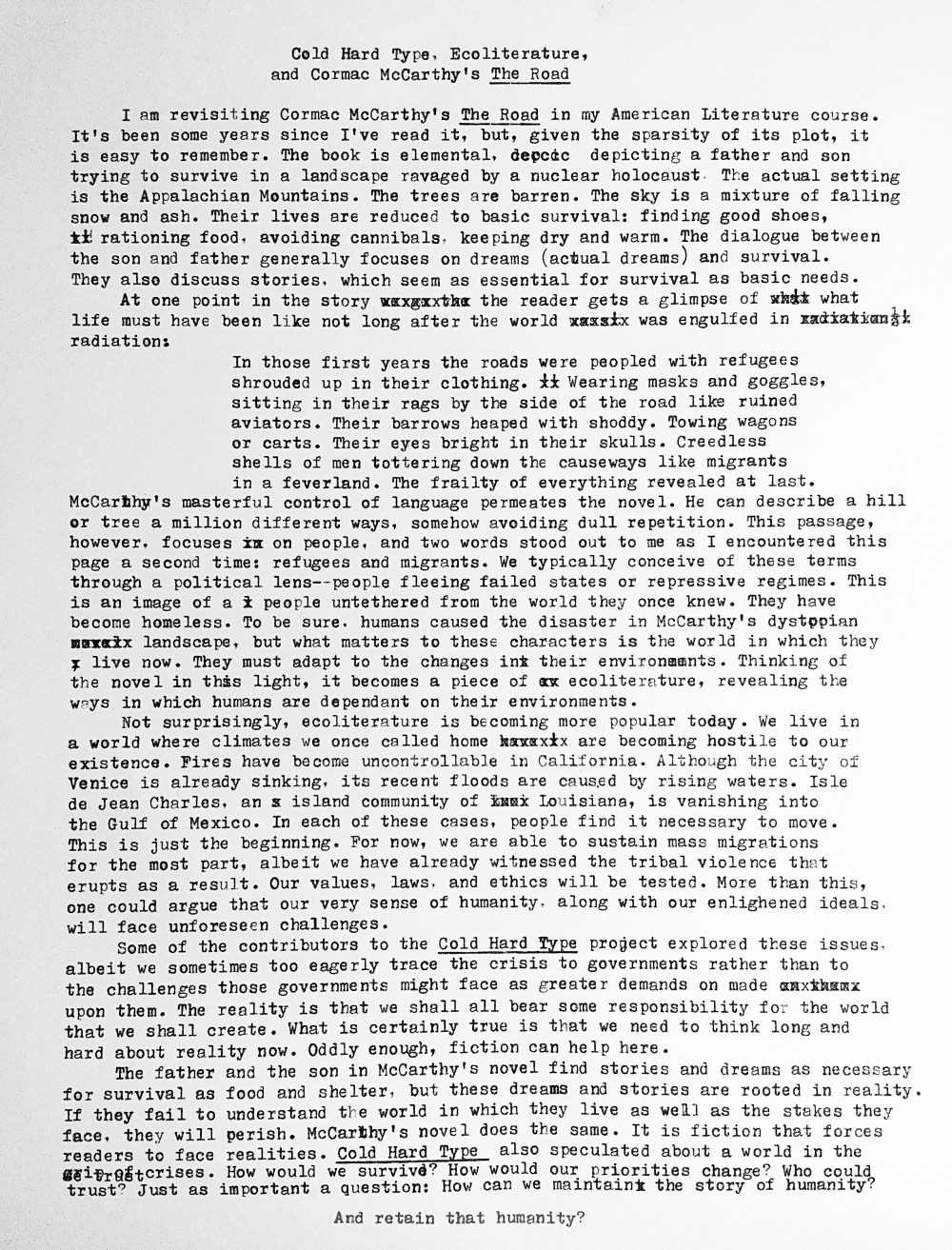 Cold Hard Type, Ecoliterature, and Cormac McCarthy’s The Road Posted by McFeats on November 18, 2019 Share this: Share on X (Opens in new window) X Share on Facebook (Opens in new window) Facebook Like Loading...