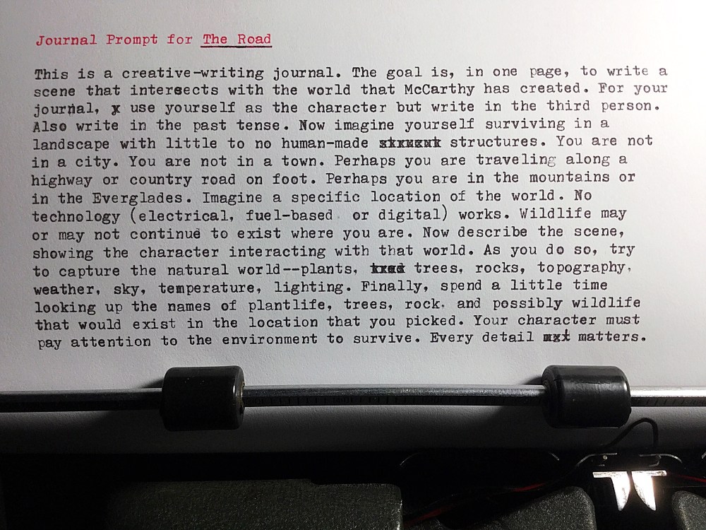 If you don’t have the time to write a novel in November but have a hankering to do some creative writing, you might like this prompt I used for American Lit. My students are reading Cormac McCarthy’s The Road, just in time to cheer them up for Thanksgiving. The novel tells a post-nuclear holocaust story about a father and son trying to survive as scavengers in a hostile landscape. It’s like Jack London mixed with radiation. My class has been doing a lot of literary analysis this semester. It was time for something creative.