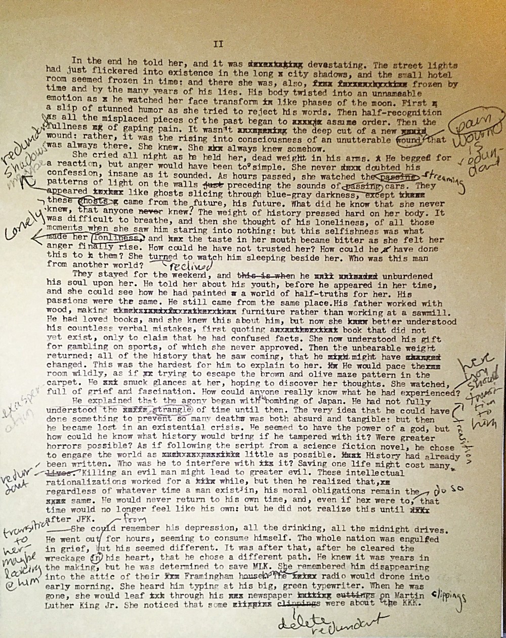 I’m still thinking through ideas for my story for Cold Hard Type. Some ideas will make the cut. Others won’t. One scene I drafted features a moment in which the time traveler, who remained stuck in the past, finally confesses to his wife of many years that he is from a different time. He takes her to a hotel to reveal the truth. How can one imagine how such characters would behave and react? Imagine all of the emotions and thoughts she would experience. Imagine her questions. The idea is absurd, yet it must be depicted. I’m not sure how well the draft worked, but what I do know is that, every time I draft a scene, I find myself becoming more intimate with, and knowledgable about, my characters. They become more nuanced and real in my mind.