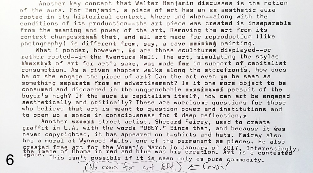 Addendum: Walter Benjamin equates dehistoricized art with fascism and art returned to historical context with communism. What remains clear is that art and the artist, particularly in the digital age, have little say in how art (and image) is received by the public. The battle over retaining historical context is fought and lost every day. The other day I displayed an image of the 2017 Women’s March to my students. I asked them what the protesters’ pink hats, ears and all, symbolized. One student answered, “Women wear pink.”