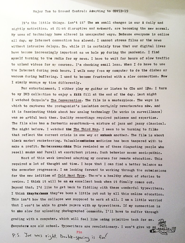 I’m eating pan-seared left over pizza with scrambled eggs for breakfast, and attempting a blog article with a thermal Typers. 1-1/2 line spaced. Stay well.