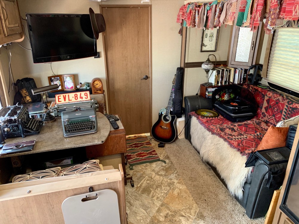 This may be a record for the number of typewriters in an RV … it looks like a cool, romantic set-up.