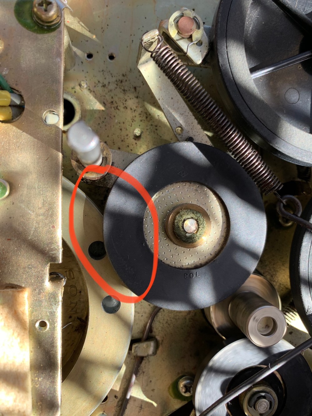 First I noticed that the low black wheel (apologies for the amateur descriptions) did not line up with the large beige wheel beneath, the latter of which plays the recording.