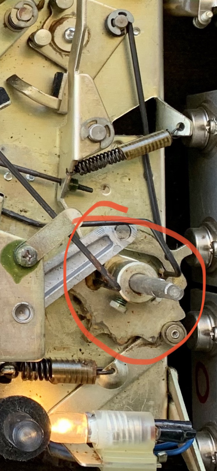 If I am correct, years of usage have worn metal away, which lowers the tension lever too low, thus raising the lever too high at the rubber spool, pushing the spool into the axle. I certainly cannot solder anything into it. The switch is violent as it switches from one setting to the next. Anything I add would be destroyed. Could I sand down the rubber spool, making it thinner, thus allowing the reel to pass unhindered? Maybe. I have to think through these issues. It is important that I stick within my abilities. This is her father’s reel-to-reel. I certainly hope I can get it working for her.