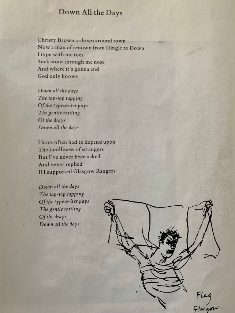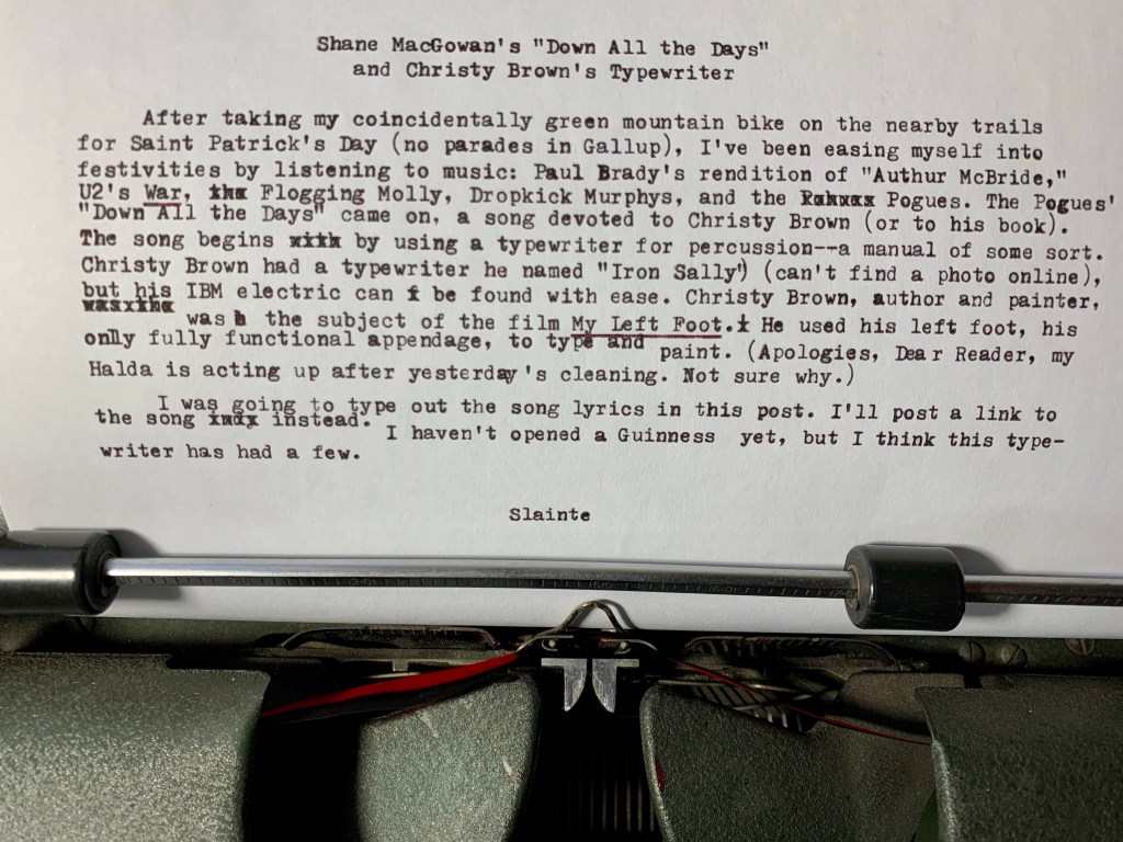 Shane MacGowan’s “Down All the Days” and Christy Brown’s Typewriter (A Saint Pat’s Post) Posted by McFeats on March 18, 2022 “Down All the Days”: https://youtu.be/XC9Ou2K55Zc Share this: Share on X (Opens in new window) X Share on Facebook (Opens in new window) Facebook Like Loading...