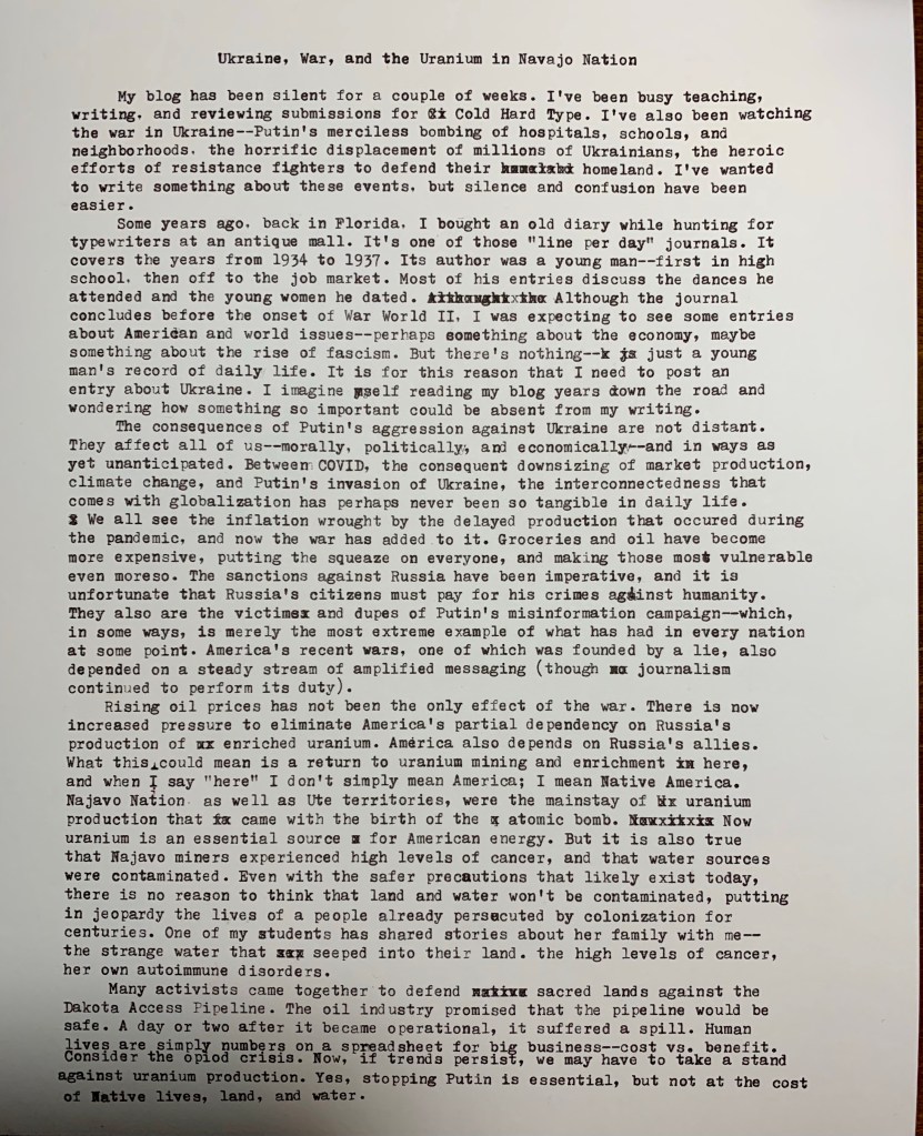 Ukraine, War, and the Uranium in Navajo Nation Posted by McFeats on April 3, 2022 https://www.nytimes.com/2022/04/01/us/politics/russia-uranium-nuclear-power.html?smid=url-share https://www.npr.org/sections/health-shots/2016/04/10/473547227/for-the-navajo-nation-uranium-minings-deadly-legacy-lingers https://thehill.com/policy/equilibrium-sustainability/598471-uranium-mill-adjacent-to-bears-ears-has-become-a/amp/ https://amp.theguardian.com/us-news/2022/mar/28/native-americans-ban-russian-uranium Share this: Share on X (Opens in new window) X Share on Facebook (Opens in new window) Facebook Like Loading...