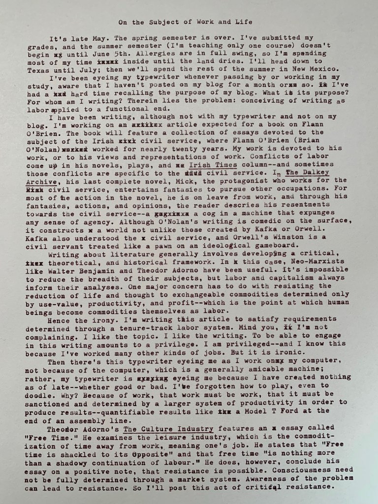 I usually turn to Walter Benjamin, rather than Adorno, when wresting with these issues. “Free Time” was a very quick read though. I like Louis Althusser, too, but he reminds me that the education system is another cog in the machine. I try to teach my students skills so that they can pursue careers–feeding the labor machine. Not that there’s much choice in the matter.