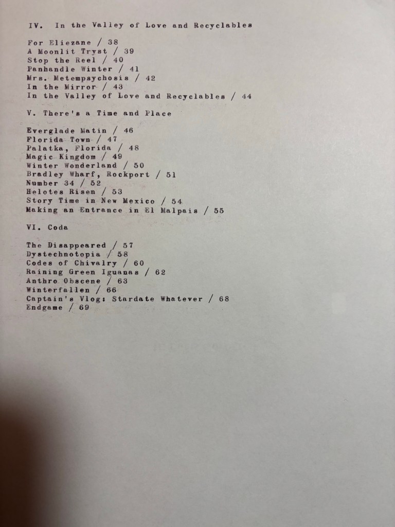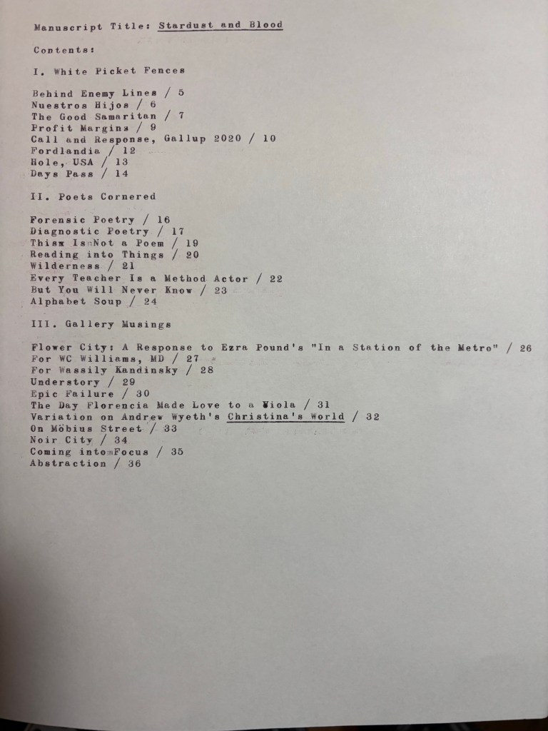 Current Table of Contents for Poetry MS: Stardust and Blood Posted by McFeats on April 25, 2026 Share this: Share on X (Opens in new window) X Share on Facebook (Opens in new window) Facebook Like Loading...